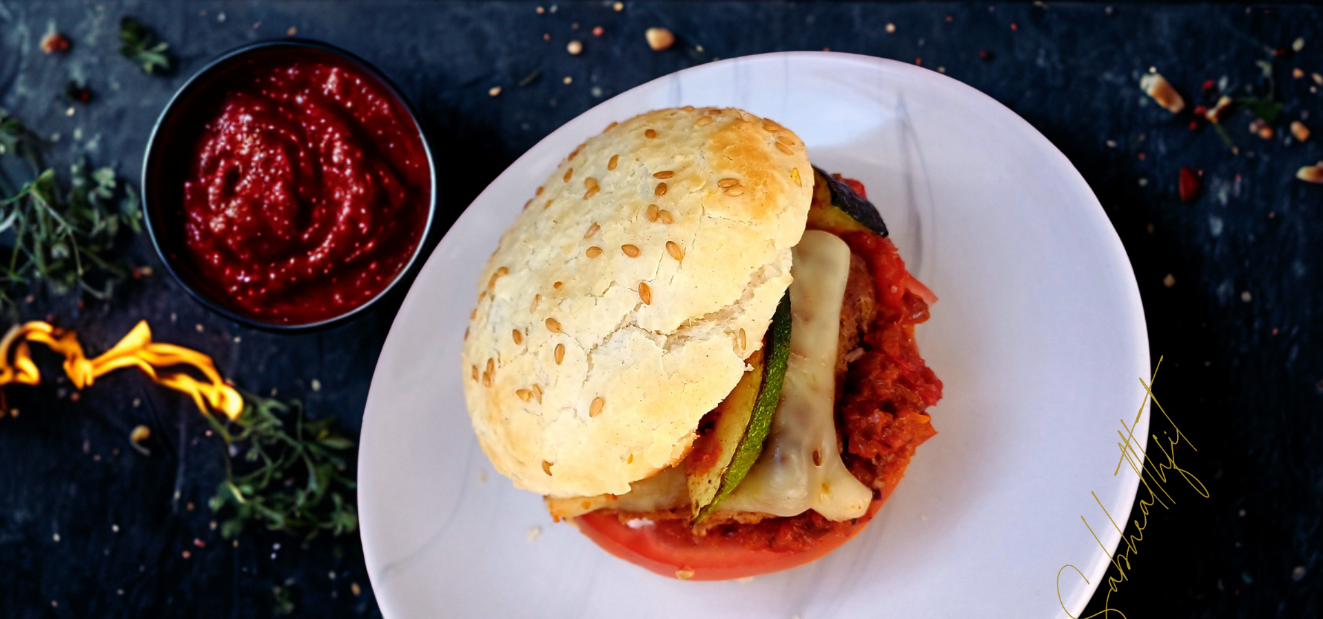 Na spodní část bulky dejte vrstvu domácího ajvaru, poté burger, plátek sýra, plátky rajčete, grilovanou cuketu a případně další ajvar.