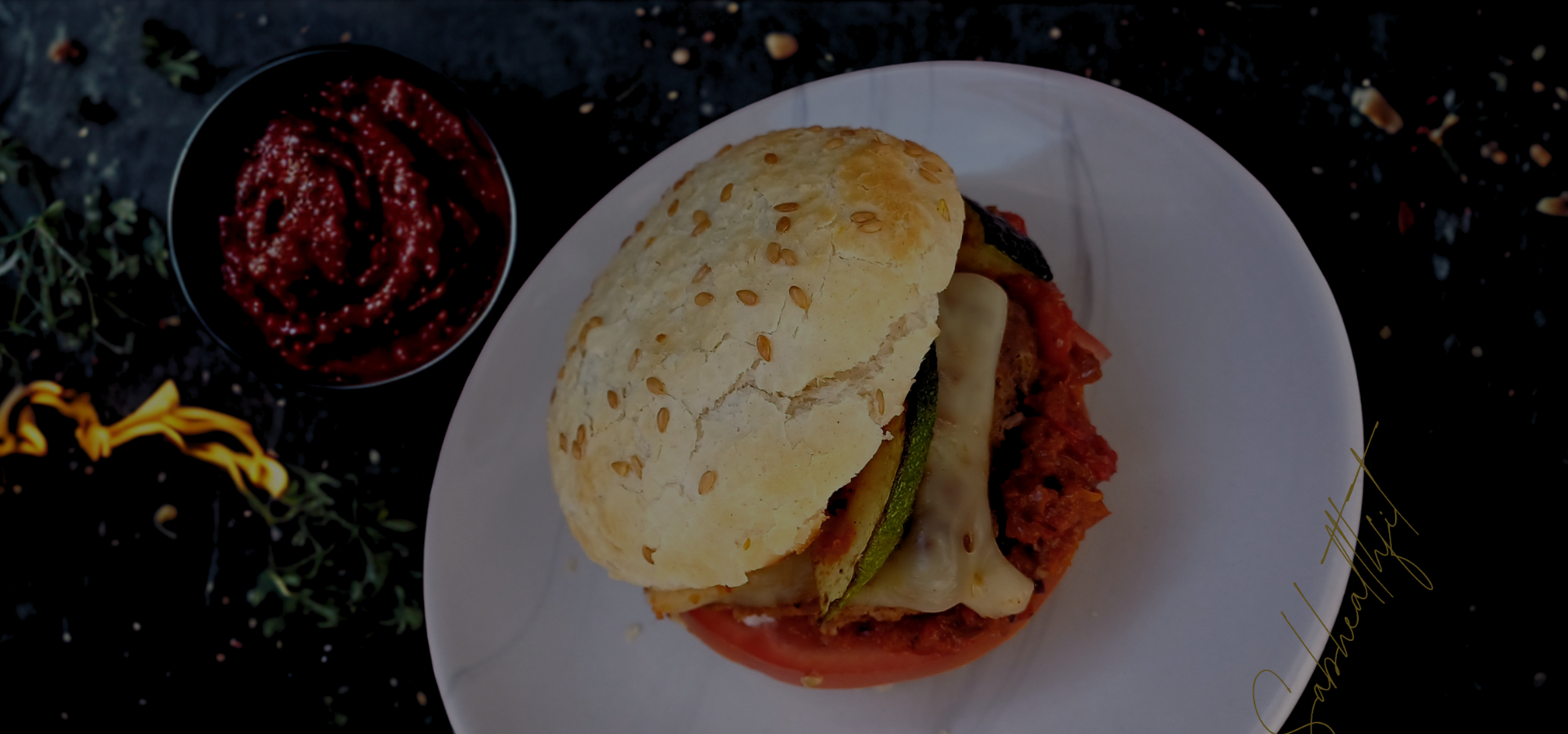 Šťavnatý hovězí hamburger s domácím ajvarem a grilovanou cuketou, servírovaný v čerstvé bulce – chuť Balkánu na každý kousnutí.