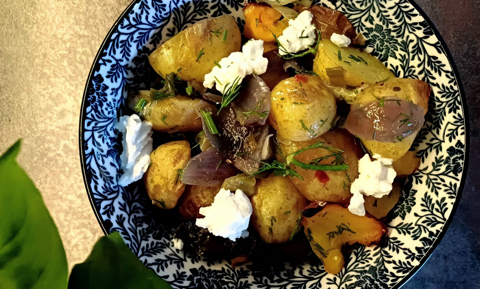 - Dobře promíchejte, rozprostřete rovnoměrně na plech a pečte v troubě předehřáté na 200 °C přibližně 25 minut – dokud nejsou brambory zlatavé a měkké