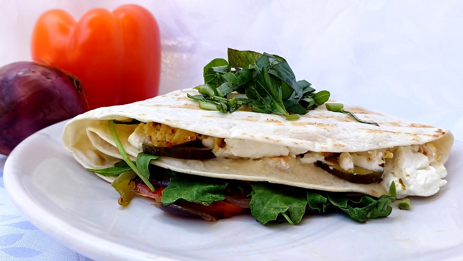 Quesadilla na středomořský způsob s kozím sýrem, rukolou, červenou cibulí a bazalkou je svěží, lehká a plná výrazných chutí. Kozí sýr dodá krémovost a bílkoviny, rukola přidá jemnou pikantnost a antioxidanty, červená cibule osvěží a bazalka celé jídlo provoní. Ideální volba na lehký oběd nebo rychlou večeři.